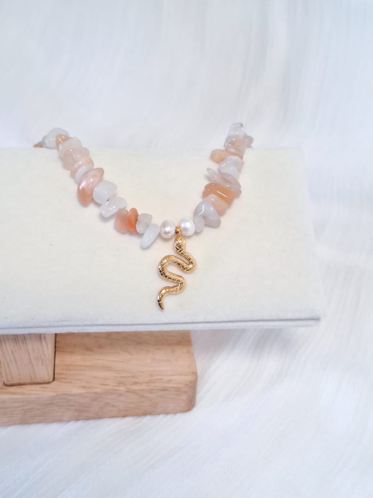 Collar hecho de Piedras Naturales y Perlas de Río, con acabados en Acero Inoxidable.
